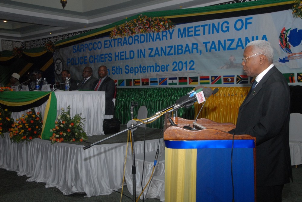 Makamu wa Rais wa Jamhuri ya Muungano wa Tanzania, Dkt. Mohammed Gharib Bilal,akipokea zawadi kutoka kwa Mkuu wa Jeshi la Plisi, Inspekta Genarali, Saidi Mwema, baada ya kufungua mkutano wa Wakuu wa Majeshi ya Polisi kutoka Nchi za Kusini mwa Afrika (SADC) wa kujadili uhalifu wa Kimataifa kuhusu madawa ya kulevya na kuimarisha uhusiano kwa nchi za Afrika kiulinzi. Kushoto ni Mkuu wa Jeshi la Polisi wa Afrika ya Kusini, Picha na OMR